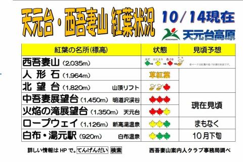 - 2025年10月14日時点の紅葉情報です天元台中吾妻展望台付近の紅葉は見頃を迎え、