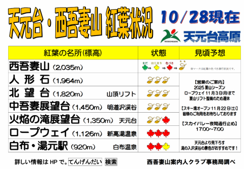 2025年10月28日時点の紅葉情報です天元台ロープウェイ周辺の紅葉は見頃を迎え、
